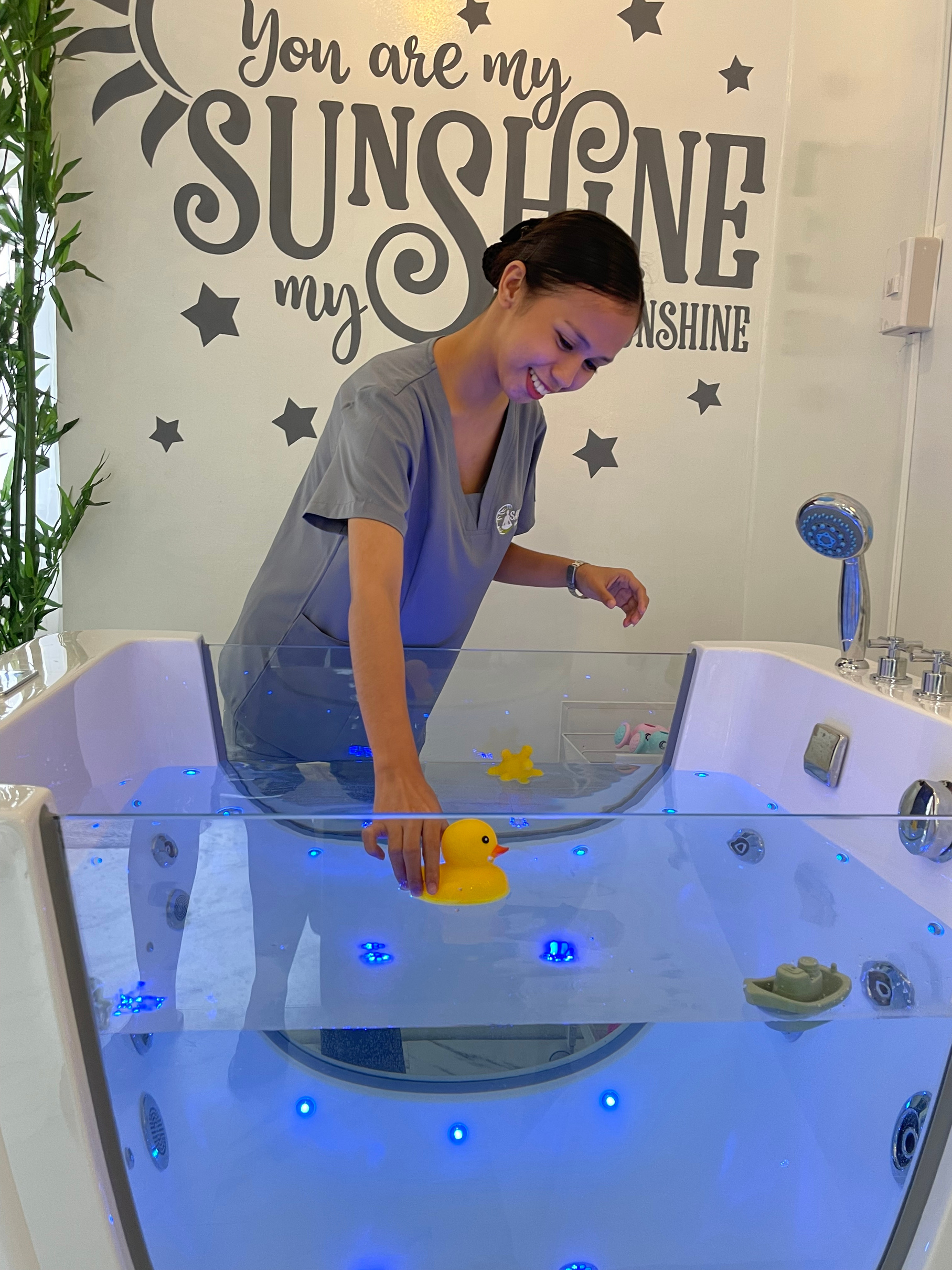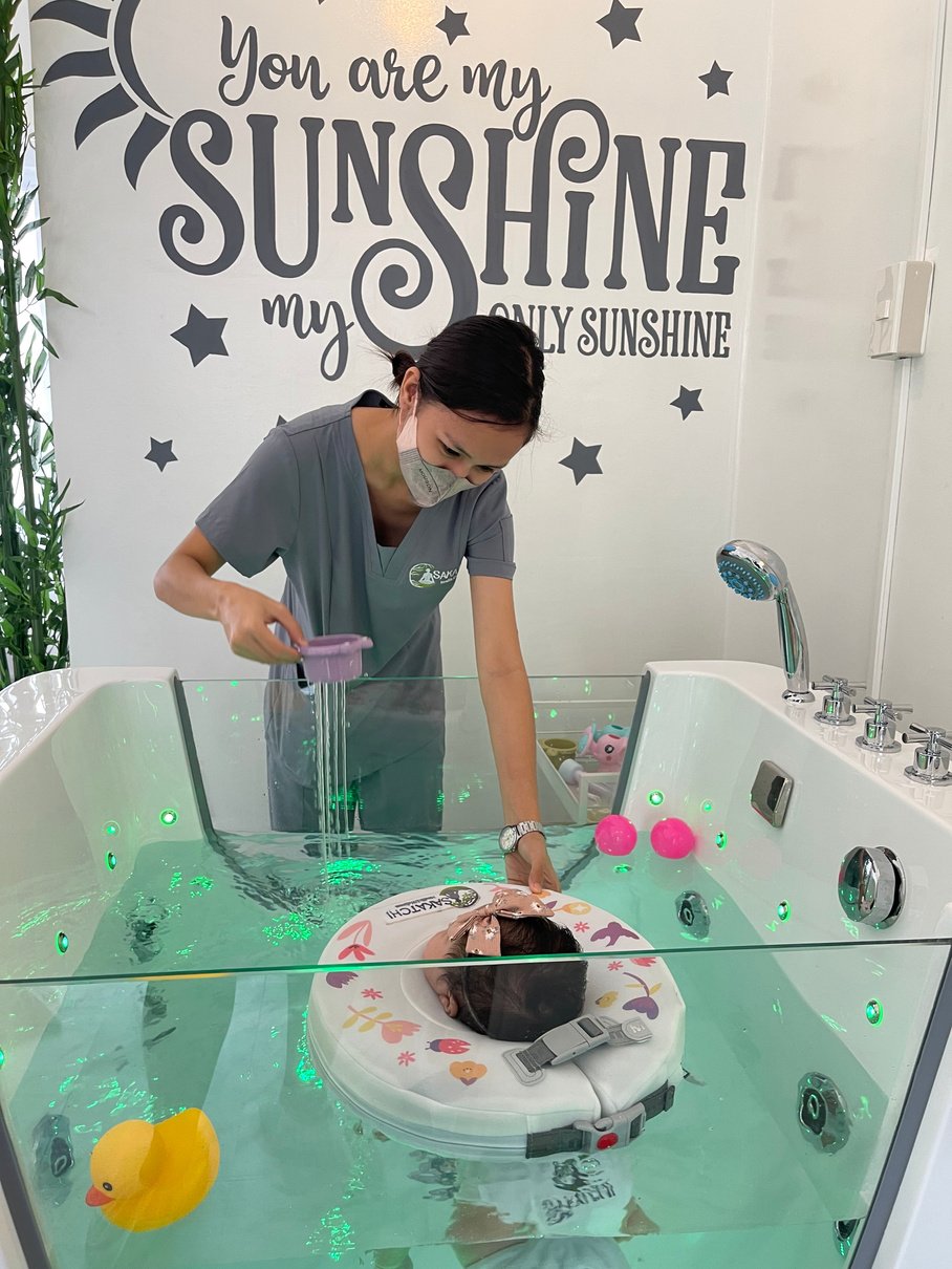 Hydrotherapy and massage for babies from 8 weeks – 9 months old . Hydrotherapy will take 20-25 minutes in a bathtub while wearing waterproof swim diaprer and floating device around their necks